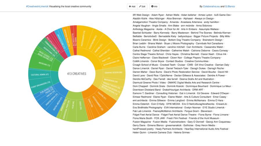We have designed a tool that allows us to view the structure of the local creative scene - who makes it and what the activities are. To do this, we started with an initial list of creative people compiled through an Internet search. Each creative has been labeled according to his or her main activities, following the twelve categories for the creative and cultural sector proposed in the document ‘The Economy of Culture in Europe’ from the European Commission.