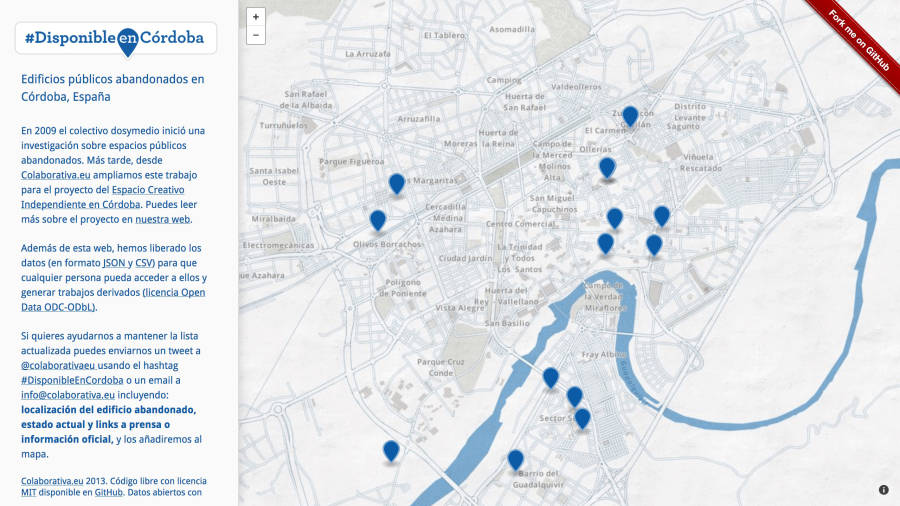 Additionally to publishing the web, we have released the data (in JSON and CSV format) so anybody can access them and generate derivative works with no restrictions. Our aim is to maintain the list as detailed and up-to-date as possible so any citizen, organization or association could use the compiled information. If you like to help us to complete the list and keep it up-to-date then send us a tweet to @colaborativaeu using the hashtag #DisponibleEnCordoba or an email to info@colaborativa.eu with the building location and status, and press links or official information.